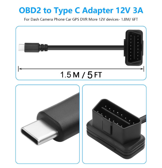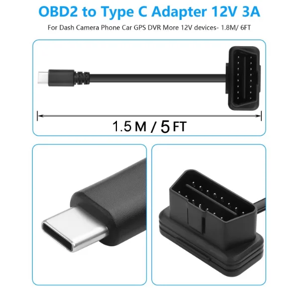 OBD2 to Type-C OBD 16Pin 12V Connector Plug Play Universal for DVR Phone GPS Car Diagnostics Cable